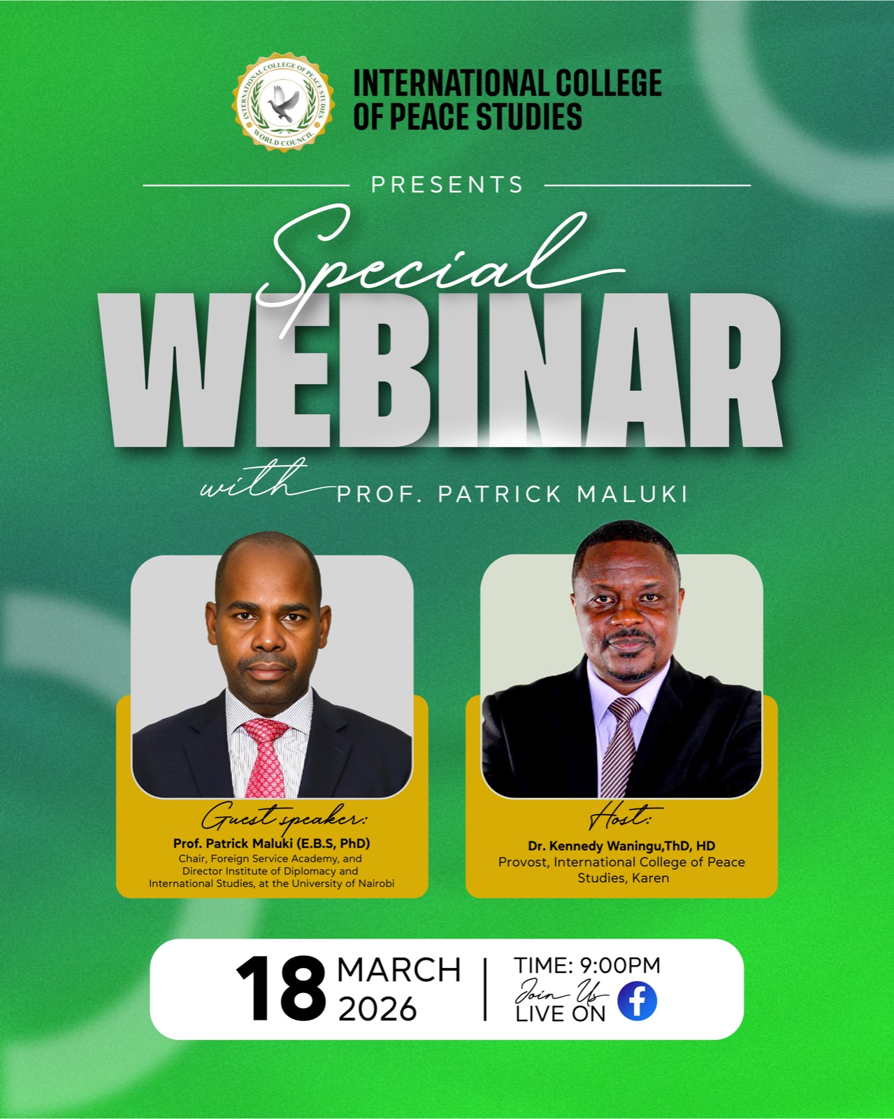 Today, the chairman of the Foreign Service Academy will participate in a webinar hosted by the International College of Peace Studies. The webinar will be live on Facebook at 9.00pm EAT